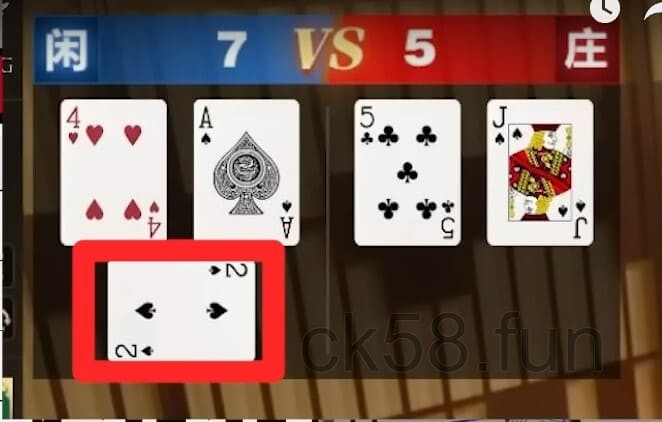 在第一局中閒家獲得「4、Ace、2」,合計「7點」;莊家獲得「5、J」,合計「5點」,以閒家勝出,而百家樂安定值計算方式如下:
